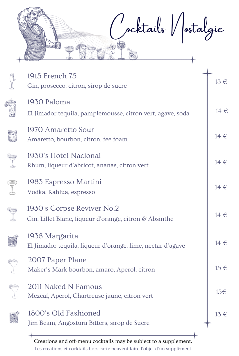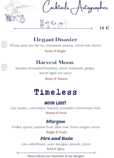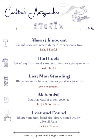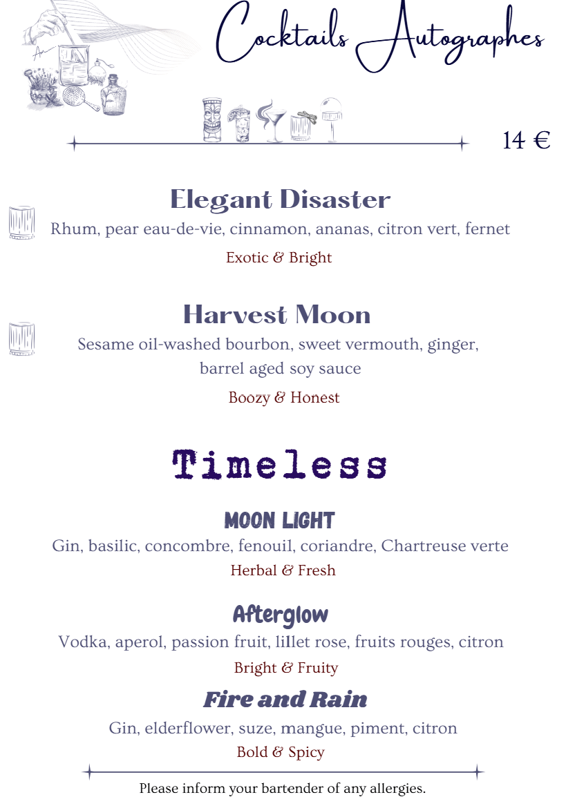 "Si vous avez des allergies, veuillez consulter votre barman. De plus, si vous avez une préférence pour un classique